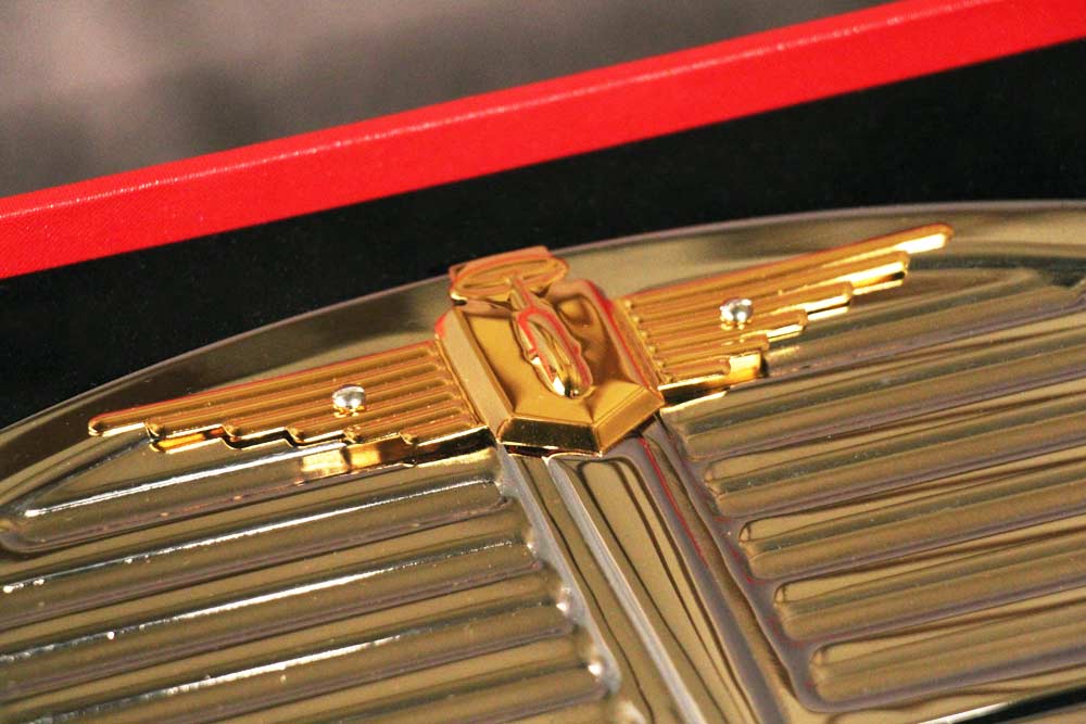 The book sits in a double-welled hand-made solander box which is covered in cloth upon which is printed a photograph of the dashboard. The box is lined with a mix of cloth and suedel. Opening the box, one is presented with a genuine flat pressing of a J40 grille with a very special gold plated badge, mounted on a hinged leaf. Below the grille is a brass plated plaque authenticating this. Under this leaf resides a buckram-bound portfolio containing brand new prints of original documents, to include a rarely seen brochure from the opening of the factory in 1949. The portfolio being tied with appropriately-coloured ribbon.