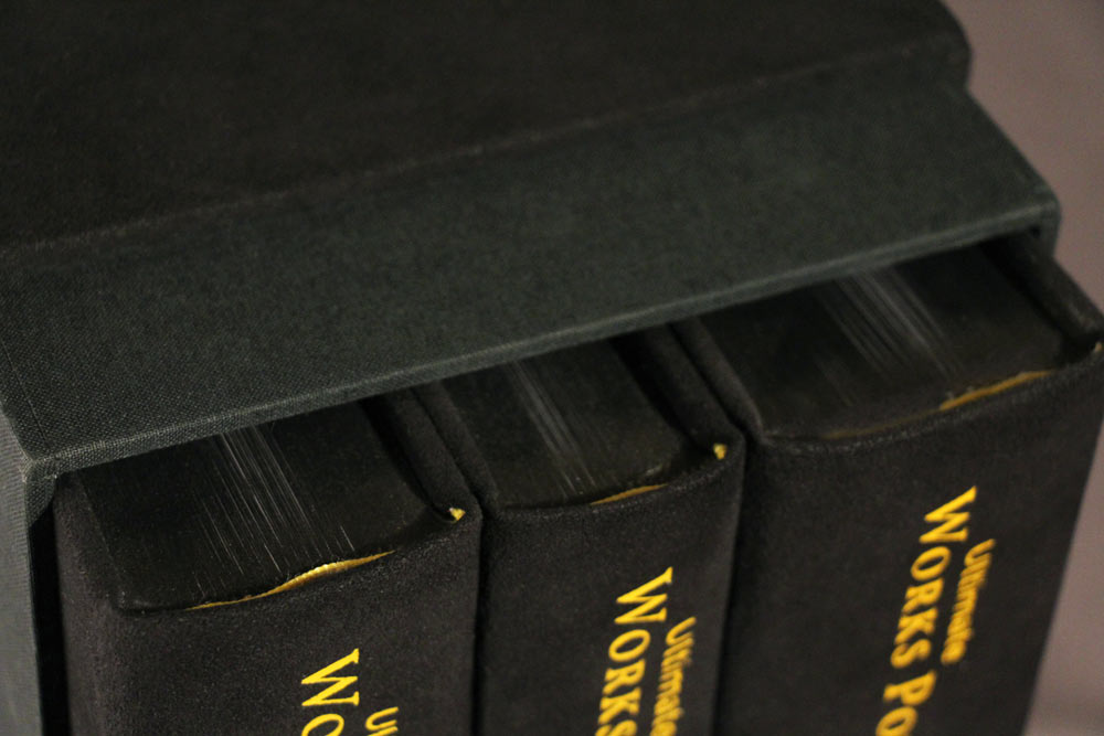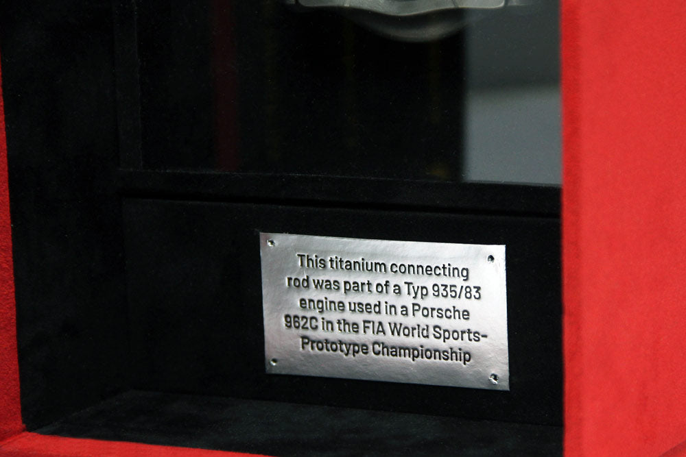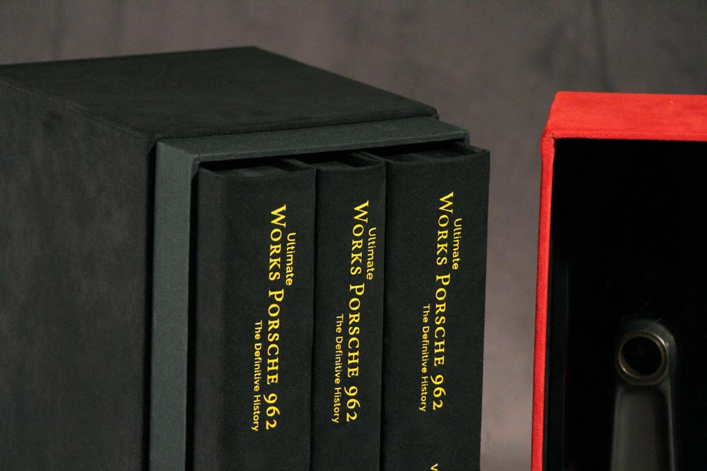 Limited to just 19 copies, to represent the number of official Porsche Works 962 cars, the Owner’s Edition is hand-bound in black Alcantara and features debossed yellow-foiled script on the cover and spine along with black page edges. The three-volume set is presented in a matching black Alcantara-covered slipcase lined with black Suedel. The slipcase is capped in contrasting red Alcantara. Within the black Suedel-lined cap, securely positioned beneath a Perspex cover, is a certified connecting rod from one of the engines used in a Porsche 962C in the FIA World Sports-Prototype Championship.