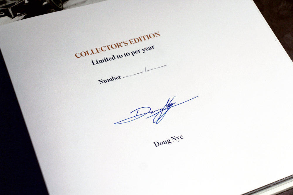 The Collector's Edition is an even more special version of this stunning very limited edition book. While the Classic Edition is limited to just 100 copies per year, a maximum of a mere 10 copies of the Collector's Edition will be produced per year worldwide. For those who love the art of the specialist binder, this edition is bound in white leather, has dedicated end-papers, the page edges gilded in silver, a marker ribbon added and foil blocked on the front and spine. To set this off, the Collector's Edition has a slipcase trimmed with cloth on which is printed one of the wonderful, evocative images from this very special book.